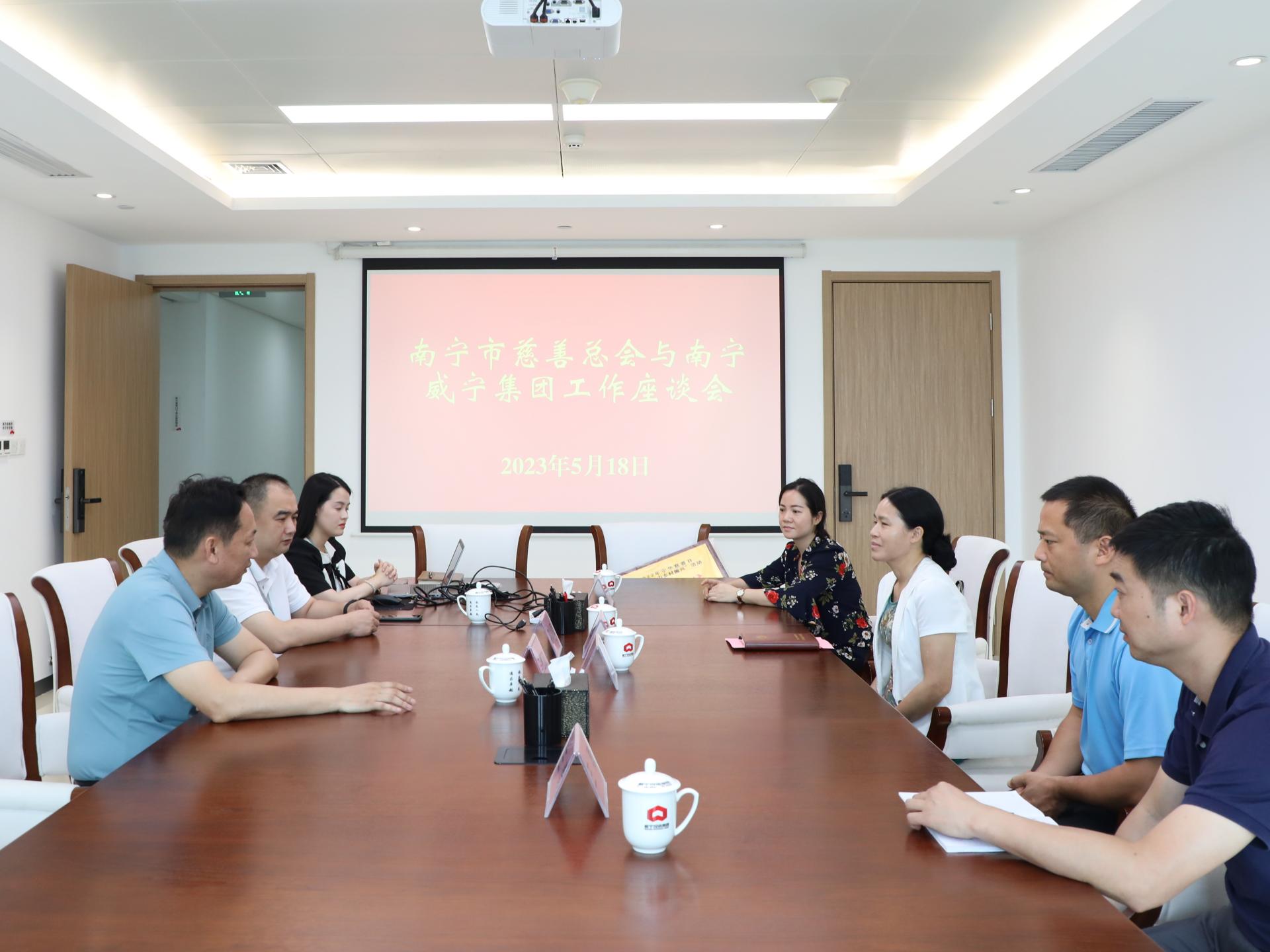 5月18日,南寧威寧集團黨委副書記馬超毅與南寧市慈善總會副會長、秘書長農雅琴一行在威寧總部大廈召開工作座談會,雙方就深化鄉村振興、落實慈善工作進行深入交流。