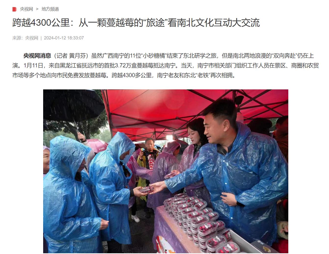 新年伊始,“蔓越莓”和“砂糖橘”成為了全國人民最為關注的“熱詞”,從黑龍江到廣西,這場橫跨4000多公里的雙向奔赴,構成一幅跨越山川湖海的感人畫卷。2024年1月11日-14日,第一批來自黑龍江的蔓越莓在邕州古城·三街兩巷進行發放,邕州古城·三街兩巷再次成為了全國人民關注的話題焦點。邕州古城·三街兩巷用一幕幕的“莓”好時刻,傳遞著東北“老鐵”與南寧“老友”的深厚情誼,構建兩地人文交融新橋梁。