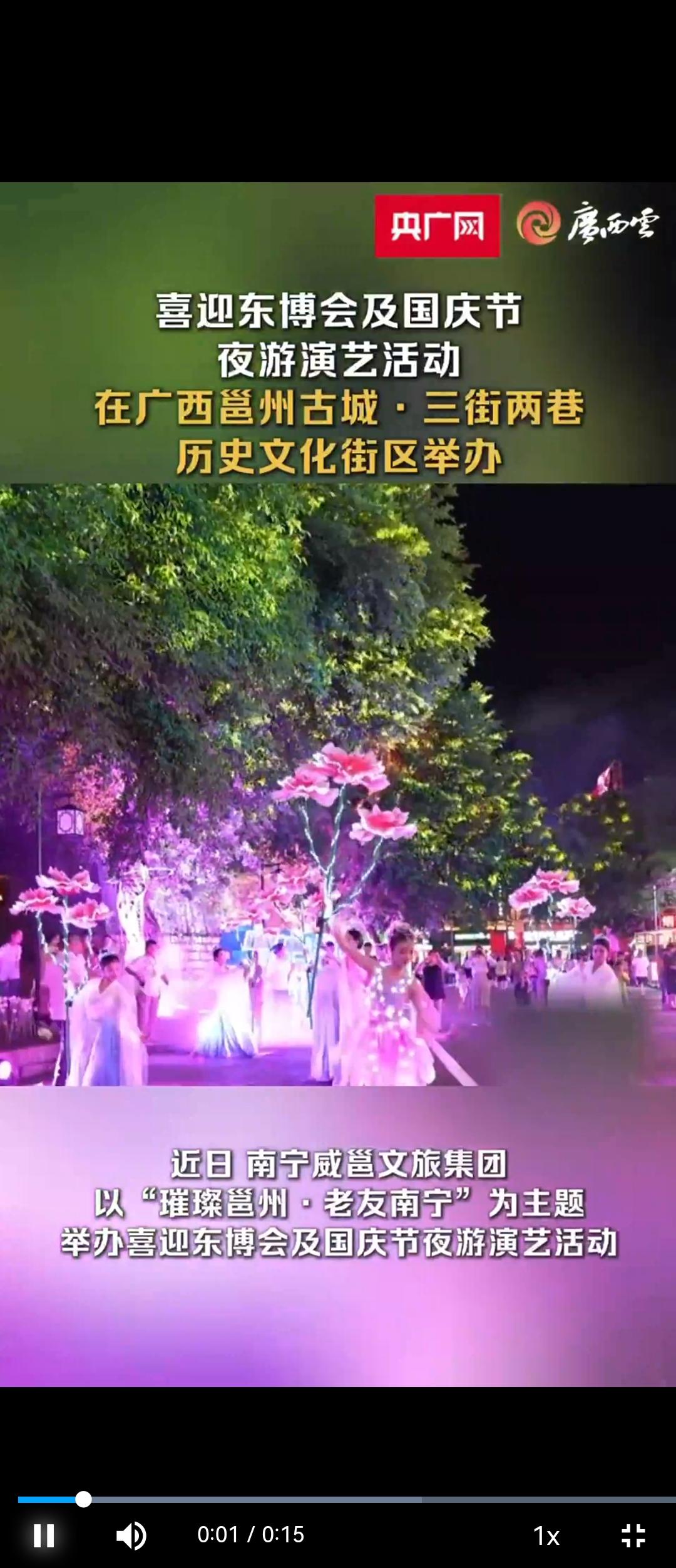 南寧市融媒新媒體平臺在活動期間,通過“南寧文旅”等多個官方新媒體賬號,對光影演繹活動進行了4場精彩的直播聯動。這些直播不僅讓觀眾能夠身臨其境地感受光影的震撼與美麗,還通過互動環節增強了觀眾的參與感與體驗感,進一步提升了活動的傳播力與影響力,讓“璀璨邕州·老友南寧”成為了東博會和峰會及國慶期間最耀眼的文化名片之一。在邕州古城·三街兩巷的抖音賬號,也分別在東博會和峰會期間和國慶節當天開通了兩場直播,通過兩場不同角度和主題的直播,既向廣大東盟和外地游客介紹了三街兩巷的參觀游覽路線,也著重展現了本次活動的精華演出,吸引了眾多網友線上觀看后,再來線下打卡。