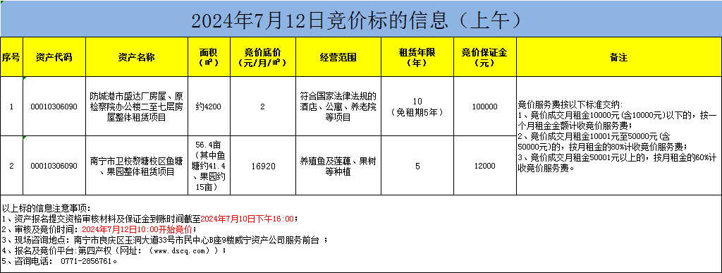 2024年7月12日競(jìng)價(jià)標(biāo)的信息(線上競(jìng)價(jià))